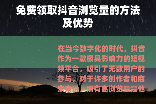 在当今数字化的时代,抖音作为一款极具影响力的短视频平台,吸引了无数用户的参与,对于许多创作者和商家来说,拥有高浏览量是他们在抖音上取得成功的关键之一,而免费领取浏览量抖音的方法,也成为了大家关注的热点话题。