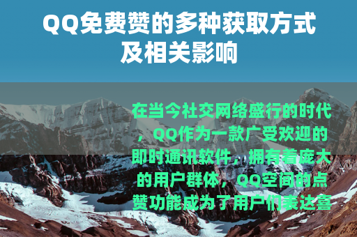 QQ免费赞作为QQ空间中的一个现象,为用户带来了更多的社交乐趣和机会,通过合适的途径获取免费赞,可以让我们的QQ空间更加丰富多彩,提升我们的社交体验,但同时,我们也要保持理性和适度,注重内容质量和自身的发展,让QQ免费赞真正成为我们社交生活中的一个有益补充,而不是成为一种负担或追求虚荣的手段,在享受免费赞带来的好处的同时,也要不断提升自己,用优秀的内容和真诚的互动去赢得更多真正的关注和喜爱。 能满足您的需求,您可以根据实际情况进行调整和修改,如果您还有其他想法或要求,请随时告诉我。