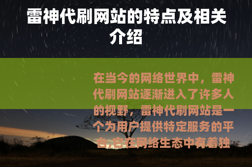 在当今的网络世界中,雷神代刷网站逐渐进入了许多人的视野,雷神代刷网站是一个为用户提供特定服务的平台,它在网络生态中有着独特的存在方式。