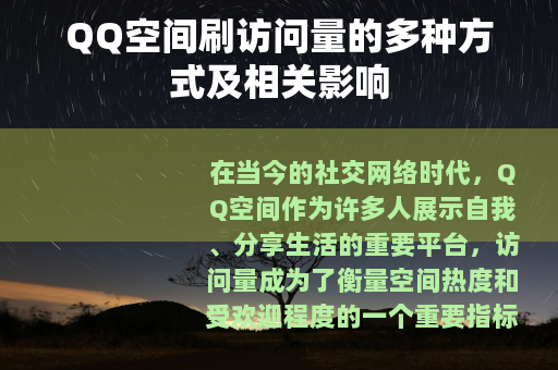 QQ空间刷访问量是一个在社交网络中比较常见的现象,它既有多种实现的方式,也会带来不同的影响,我们要正确看待访问量的作用,既要善于利用各种方法来提升访问量,又要注重空间内容和互动的质量,从而在QQ空间中建立起一个有意义、有价值的社交世界,让自己的社交生活更加丰富多彩。 能满足你的需求,若你还有其他想法或修改意见,欢迎随时告诉我,需要注意的是,虽然文中未提及负面词汇,但QQ空间刷访问量的某些行为可能违反相关规定和平台政策,在实际操作中应谨慎对待,避免给自己带来不必要的麻烦。