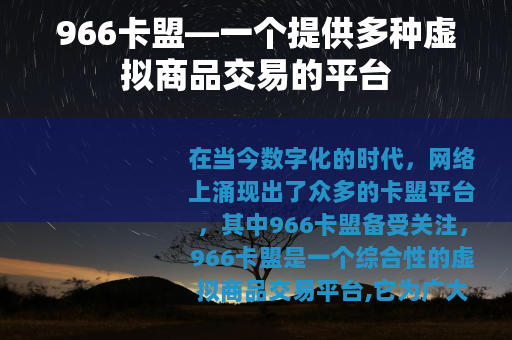 在当今数字化的时代,网络上涌现出了众多的卡盟平台,其中966卡盟备受关注,966卡盟是一个综合性的虚拟商品交易平台,它为广大用户提供了丰富多样的交易选择。