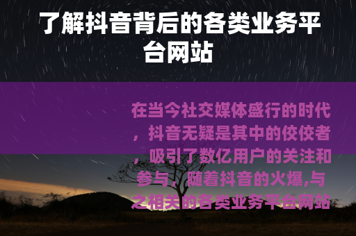 在当今社交媒体盛行的时代,抖音无疑是其中的佼佼者,吸引了数亿用户的关注和参与,随着抖音的火爆,与之相关的各类业务平台网站也如雨后春笋般涌现。