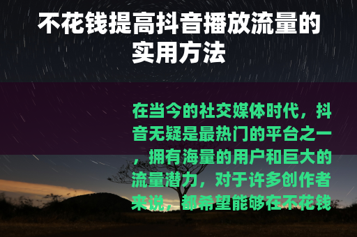 在当今的社交媒体时代,抖音无疑是最热门的平台之一,拥有海量的用户和巨大的流量潜力,对于许多创作者来说,都希望能够在不花钱的情况下提高自己抖音作品的播放流量,以下是一些实用的方法可供参考。