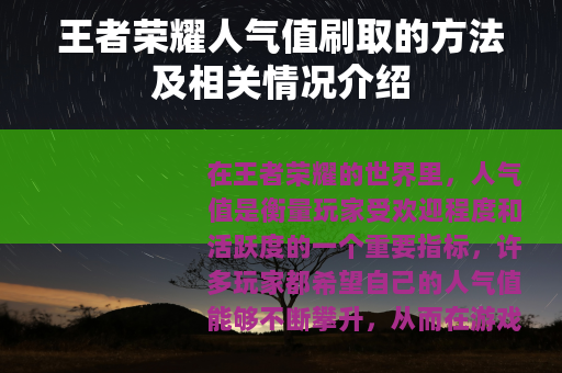 在王者荣耀的世界里,人气值是衡量玩家受欢迎程度和活跃度的一个重要指标,许多玩家都希望自己的人气值能够不断攀升,从而在游戏社区中获得更多的关注和认可,关于王者荣耀人气值的刷取,有一些方法和途径值得我们去了解。