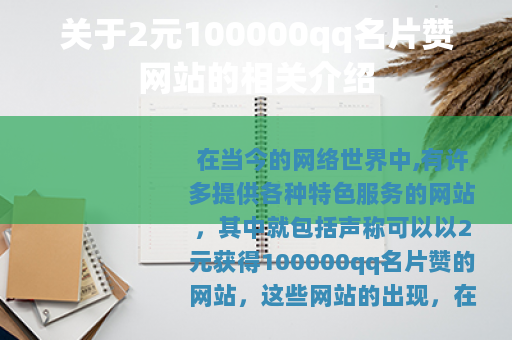 在当今的网络世界中,有许多提供各种特色服务的网站,其中就包括声称可以以2元获得100000qq名片赞的网站,这些网站的出现,在一定程度上满足了部分用户对于提升自己在QQ社交平台上人气和关注度的需求。