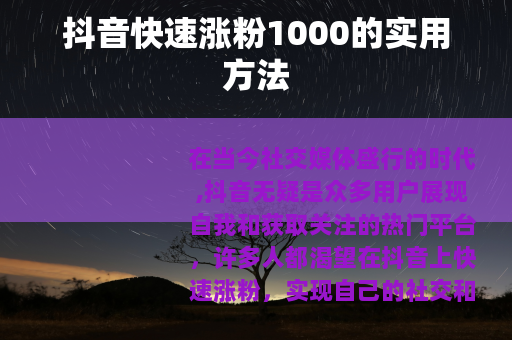在当今社交媒体盛行的时代,抖音无疑是众多用户展现自我和获取关注的热门平台,许多人都渴望在抖音上快速涨粉,实现自己的社交和商业价值,如果你也想在抖音上快速涨粉达到1000个,以下是一些实用的方法可供参考。