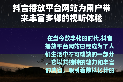 在当今数字化的时代,抖音播放平台网站已经成为了人们生活中不可或缺的一部分,它以其独特的魅力和丰富的内容,吸引着数以亿计的用户在这个虚拟的世界中尽情遨游。