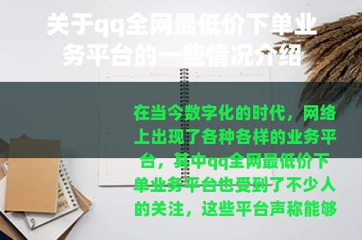 在当今数字化的时代,网络上出现了各种各样的业务平台,其中qq全网最低价下单业务平台也受到了不少人的关注,这些平台声称能够以较低的价格提供与qq相关的各种业务服务,吸引了众多用户的目光。