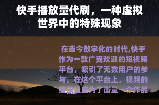 在当今数字化的时代,快手作为一款广受欢迎的短视频平台,吸引了无数用户的参与,在这个平台上,视频的播放量成为了衡量一个作品受欢迎程度的重要指标之一,而随着市场需求的不断增加,快手播放量代刷这一现象也逐渐浮出水面。