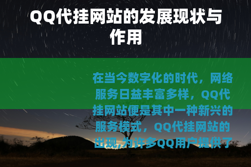在当今数字化的时代,网络服务日益丰富多样,QQ代挂网站便是其中一种新兴的服务模式,QQ代挂网站的出现,为许多QQ用户提供了便利和独特的体验。