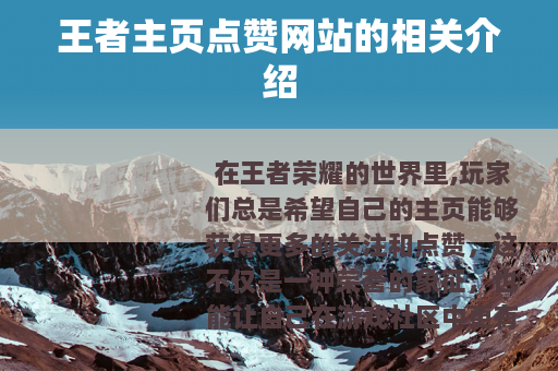 在王者荣耀的世界里,玩家们总是希望自己的主页能够获得更多的关注和点赞,这不仅是一种荣誉的象征,也能让自己在游戏社区中更有存在感,而王者主页点赞网站便应运而生,为玩家们提供了一个获取更多点赞的途径。