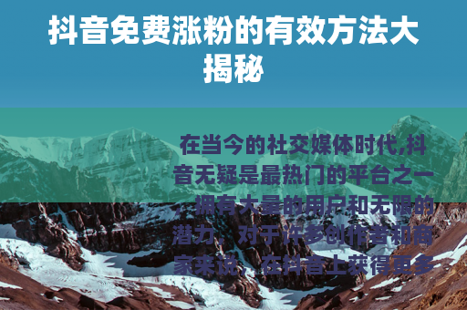 在当今的社交媒体时代,抖音无疑是最热门的平台之一,拥有大量的用户和无限的潜力,对于许多创作者和商家来说,在抖音上获得更多的粉丝是他们不断追求的目标,而今天,我们就来探讨一些抖音免费涨粉的实用方法。 质量是关键,你需要创作有趣、有价值且独特的视频内容,了解你的目标受众,知道他们感兴趣的话题和痛点,然后围绕这些来制作视频,如果你面向的是年轻的美食爱好者,那么可以制作各种美食制作教程、美食探店分享或者独特的美食创意视频等,当你的内容能够真正吸引观众,他们自然会更愿意关注你,并且会主动分享你的视频,从而帮助你扩大粉丝群体。