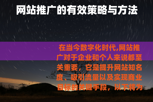 在当今数字化时代,网站推广对于企业和个人来说都至关重要,它是提升网站知名度、吸引流量以及实现商业目标的关键手段,以下将为您详细介绍一些行之有效的网站推广策略与方法。