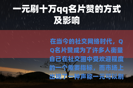 一元刷十万qq名片赞的现象虽然在一定程度上满足了部分用户快速提升名片赞数量的需求,但它也带来了诸如破坏社交生态真实性、影响用户对自身社交能力的正确认知以及对平台运营造成干扰等多方面的问题,用户在面对这种刷赞服务时,应该理性思考,权衡利弊,不要仅仅为了一时的虚荣而选择这种可能会带来诸多负面影响的方式,而应更加注重在现实生活和真实社交中不断提升自己,以获得真正有价值的社交关系和认可。