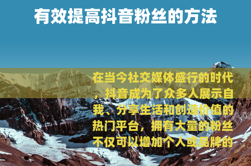 在当今社交媒体盛行的时代,抖音成为了众多人展示自我、分享生活和创造价值的热门平台,拥有大量的粉丝不仅可以增加个人或品牌的影响力,还能带来更多的机会和收益,要怎么才能把抖音粉丝提高呢?以下是一些实用的方法。