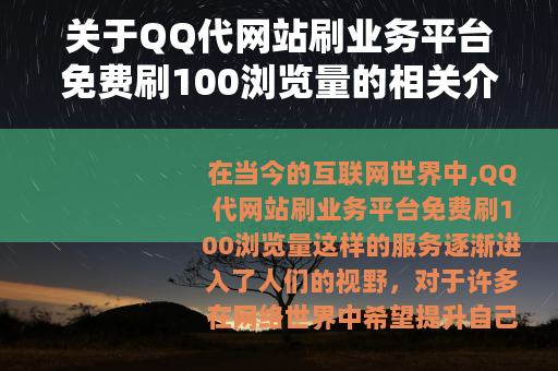 在当今的互联网世界中,QQ代网站刷业务平台免费刷100浏览量这样的服务逐渐进入了人们的视野,对于许多在网络世界中希望提升自己QQ相关业务数据的人来说,这似乎是一个颇具吸引力的选择。