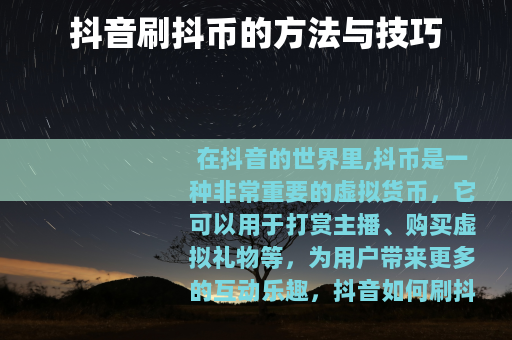 想要在抖音刷抖币,有多种合法合规且有趣的途径可供选择,用户可以根据自己的实际情况和喜好,选择适合自己的方式来获取抖币,让自己在抖音的体验更加丰富多彩。