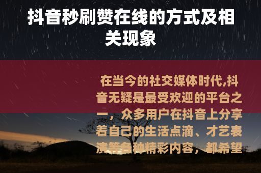 在当今的社交媒体时代,抖音无疑是最受欢迎的平台之一,众多用户在抖音上分享着自己的生活点滴、才艺表演等各种精彩内容,都希望能获得更多的点赞,以此来提升自己作品的热度和影响力,而“抖音秒刷赞在线”这一现象也随之出现并逐渐受到关注。