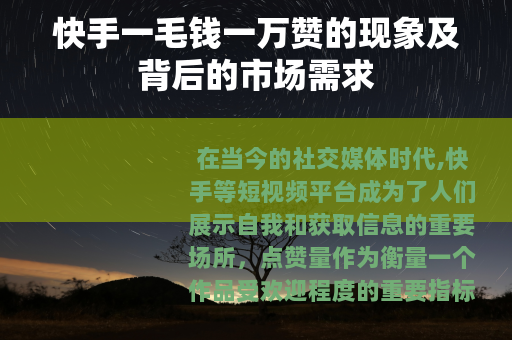在当今的社交媒体时代,快手等短视频平台成为了人们展示自我和获取信息的重要场所,点赞量作为衡量一个作品受欢迎程度的重要指标,备受用户关注,而“快手一毛钱一万赞”的现象也随之悄然兴起。