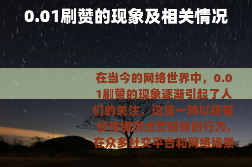 在当今的网络世界中,0.01刷赞的现象逐渐引起了人们的关注,这是一种以极低价格提供点赞服务的行为,在众多社交平台和网络场景中都有所出现。