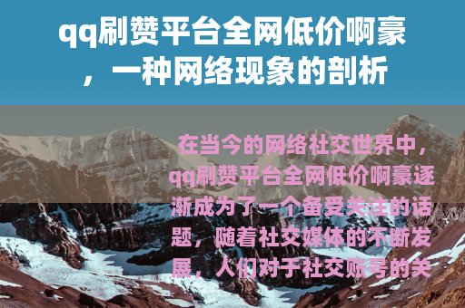 qq刷赞平台全网低价啊豪作为网络社交发展过程中的一种特殊现象,既有其存在的合理性和市场需求,也带来了一些值得我们思考和关注的问题,我们需要在享受其带来的便利和好处的同时,也要保持清醒的认识,合理利用这类平台,避免过度沉迷和依赖,共同营造一个积极、健康、真实的网络社交氛围。