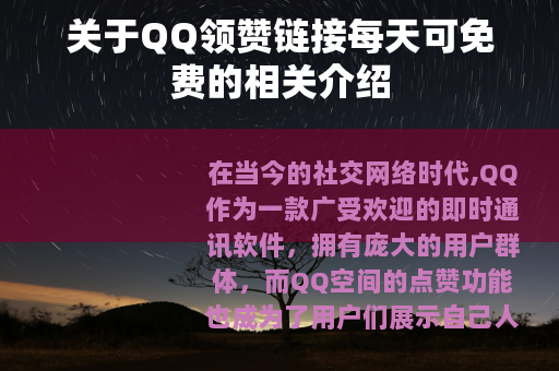 在使用QQ领赞链接时,用户也需要注意一些事项,要确保所使用的链接来源可靠,避免点击一些不明来历的链接,以免遭受不必要的风险,如个人信息泄露等,在完成相关任务时,要遵守QQ的使用规则和相关法律法规,不要进行任何违规操作,只有在合法合规的前提下,才能充分享受免费领赞链接带来的便利和好处,让自己的QQ空间更加精彩,社交生活更加丰富,QQ领赞链接每天可免费为用户提供了一个有趣且实用的社交互动途径,只要正确使用,就能在QQ社交世界中收获更多的快乐和满足。