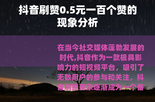 抖音刷赞0.5元一百个赞的现象是一个复杂的社会现象,它既有其存在的一定合理性,也带来了诸多问题,对于抖音平台来说,需要不断加强技术监管和规则制定,打击刷赞等违规行为,维护平台的公平和健康发展,对于创作者和商家来说,应该更加注重内容的质量和创新,通过真实的努力和才华来吸引用户的关注和喜爱,而不是依赖刷赞等不正当手段,抖音平台才能真正成为一个充满活力和创造力的社交空间,为用户带来更多有价值的内容和体验。