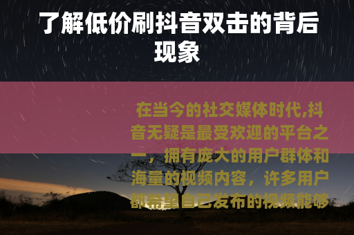 在当今的社交媒体时代,抖音无疑是最受欢迎的平台之一,拥有庞大的用户群体和海量的视频内容,许多用户都希望自己发布的视频能够获得更多的双击点赞,以增加曝光度和人气,在这种需求下,市场上出现了一种所谓的“低价刷抖音双击”的服务。
