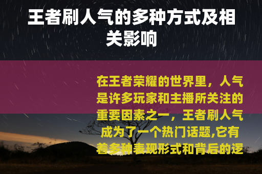 在王者荣耀的世界里,人气是许多玩家和主播所关注的重要因素之一,王者刷人气成为了一个热门话题,它有着多种表现形式和背后的逻辑。