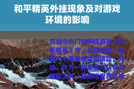 在当今热门的手机游戏《和平精英》中,外挂问题一直是一个备受关注的话题,外挂,作为一种非官方认可的辅助工具,在游戏世界中悄然滋生,对游戏的公平性和玩家的体验产生了诸多影响。