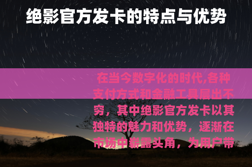 在当今数字化的时代,各种支付方式和金融工具层出不穷,其中绝影官方发卡以其独特的魅力和优势,逐渐在市场中崭露头角,为用户带来了全新的支付体验和诸多便利。