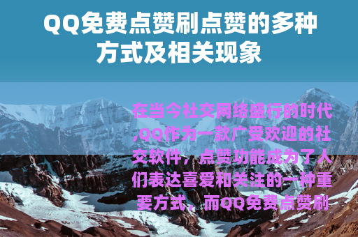 QQ免费点赞刷点赞的现象在社交网络中已经成为了一种不可忽视的存在,它既有满足用户心理需求和带来一定好处的一面,也存在着一些潜在的问题和风险,用户在参与其中时,需要理性看待,权衡利弊,在不违反平台规则和不损害自身利益的前提下,合理利用这些方式来提升自己在QQ社交中的体验和影响力,才能在享受刷点赞带来的便利的同时,保持健康、积极的社交网络生活。
