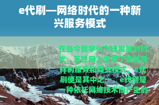 在当今数字化飞速发展的时代,互联网上出现了各种各样的服务和商业模式,e代刷便是其中之一,e代刷是一种依托网络技术而产生的服务,它在一定程度上满足了部分用户的特定需求。