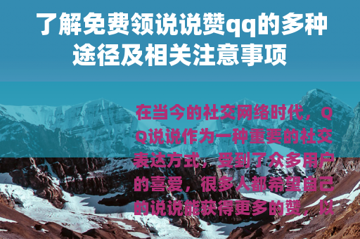 在当今的社交网络时代,QQ说说作为一种重要的社交表达方式,受到了众多用户的喜爱,很多人都希望自己的说说能获得更多的赞,以展示自己的人气和魅力,而免费领说说赞qq的方式也随之应运而生,为广大用户提供了一个提升说说热度的机会。