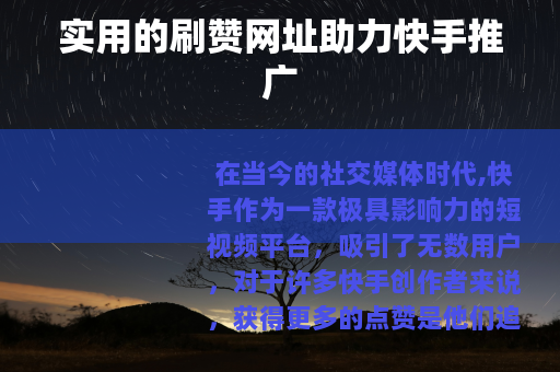 在当今的社交媒体时代,快手作为一款极具影响力的短视频平台,吸引了无数用户,对于许多快手创作者来说,获得更多的点赞是他们追求的目标之一,这不仅能增加作品的热度,还能提升账号的知名度,而刷赞网址在一定程度上为创作者们提供了一种推广快手账号和作品的途径。