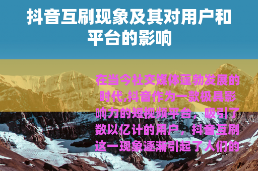 在当今社交媒体蓬勃发展的时代,抖音作为一款极具影响力的短视频平台,吸引了数以亿计的用户,抖音互刷这一现象逐渐引起了人们的关注。