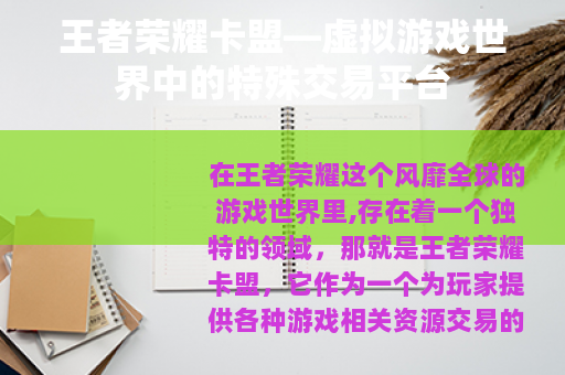 在王者荣耀这个风靡全球的游戏世界里,存在着一个独特的领域,那就是王者荣耀卡盟,它作为一个为玩家提供各种游戏相关资源交易的平台,在游戏玩家群体中有着一定的影响力。