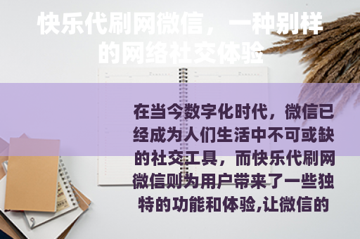 在当今数字化时代,微信已经成为人们生活中不可或缺的社交工具,而快乐代刷网微信则为用户带来了一些独特的功能和体验,让微信的使用更加丰富多彩。