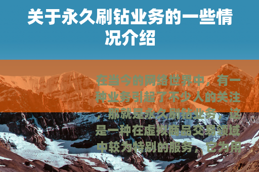 在当今的网络世界中,有一种业务引起了不少人的关注,那就是永久刷钻业务,这是一种在虚拟商品交易领域中较为特别的服务,它为用户提供了一种看似诱人的途径来获取各种网络平台的会员钻类服务,并且声称能够实现永久有效。