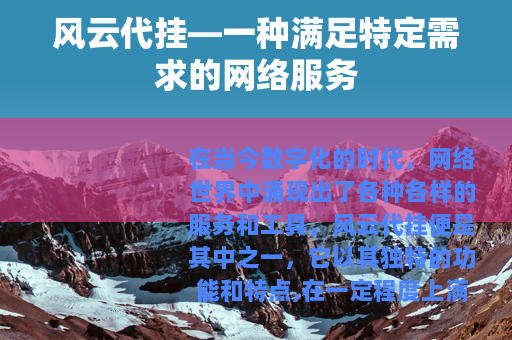 在当今数字化的时代,网络世界中涌现出了各种各样的服务和工具,风云代挂便是其中之一,它以其独特的功能和特点,在一定程度上满足了部分用户的需求。