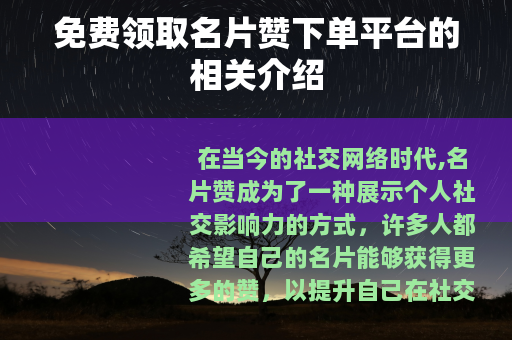在当今的社交网络时代,名片赞成为了一种展示个人社交影响力的方式,许多人都希望自己的名片能够获得更多的赞,以提升自己在社交平台上的人气,而免费领取名片赞下单平台也应运而生,为用户提供了一种获取名片赞的途径。