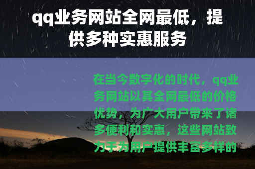 在当今数字化的时代,qq业务网站以其全网最低的价格优势,为广大用户带来了诸多便利和实惠,这些网站致力于为用户提供丰富多样的qq业务服务,满足不同用户的需求。