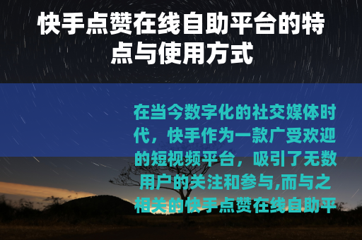 在社交媒体的大舞台上,快手点赞在线自助平台犹如一颗璀璨的新星,散发着独特的魅力,它以其独特的服务模式和功能特点,为广大快手用户带来了前所未有的便利和机遇。