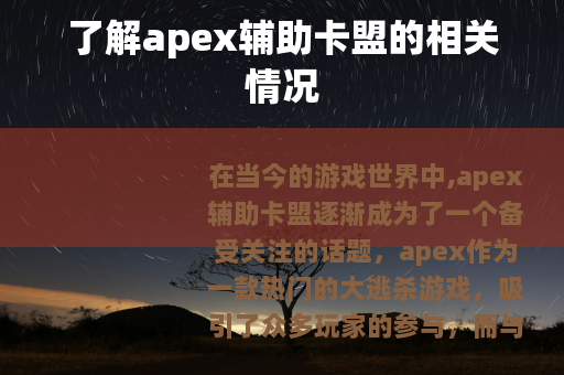 在当今的游戏世界中,apex辅助卡盟逐渐成为了一个备受关注的话题,apex作为一款热门的大逃杀游戏,吸引了众多玩家的参与,而与之相关的辅助卡盟也应运而生。