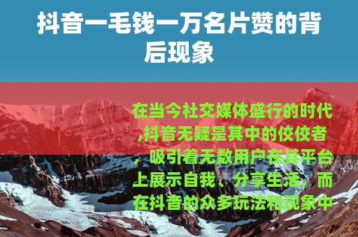 在当今社交媒体盛行的时代,抖音无疑是其中的佼佼者,吸引着无数用户在其平台上展示自我、分享生活,而在抖音的众多玩法和现象中,“抖音一毛钱一万名片赞”的情况逐渐引起了人们的关注。