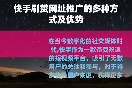 在当今数字化的社交媒体时代,快手作为一款备受欢迎的短视频平台,吸引了无数用户的关注和参与,对于许多快手用户来说,获得更多的点赞是他们追求的目标之一,这也使得快手刷赞网址推广逐渐成为一个热门话题。