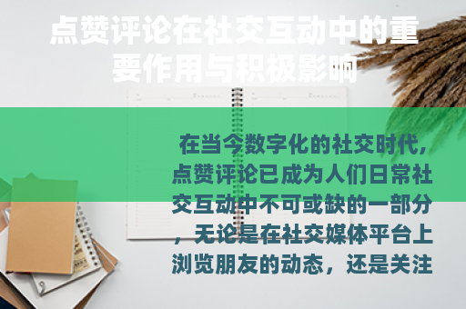 在当今数字化的社交时代,点赞评论已成为人们日常社交互动中不可或缺的一部分,无论是在社交媒体平台上浏览朋友的动态,还是关注各类公众账号的信息发布,点赞评论都以其独特的方式丰富着我们的社交体验,构建着人与人之间的联系,展现出诸多重要作用和积极影响。
