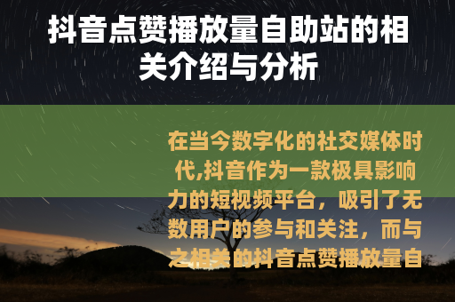 在当今数字化的社交媒体时代,抖音作为一款极具影响力的短视频平台,吸引了无数用户的参与和关注,而与之相关的抖音点赞播放量自助站也逐渐进入了人们的视野。