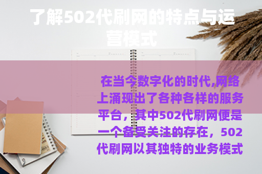 在当今数字化的时代,网络上涌现出了各种各样的服务平台,其中502代刷网便是一个备受关注的存在,502代刷网以其独特的业务模式,在一定范围内吸引了不少用户的目光。