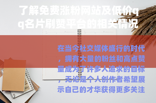 在当今社交媒体盛行的时代,拥有大量的粉丝和高点赞量成为了许多人追求的目标,无论是个人创作者希望展示自己的才华获得更多关注,还是商家想要扩大品牌影响力,粉丝和点赞数都有着重要的意义,市场上出现了各种各样声称可以免费涨粉的网站以及提供低价qq名片刷赞服务的平台,其中像啊豪所代表的这类平台也受到了不少人的关注。